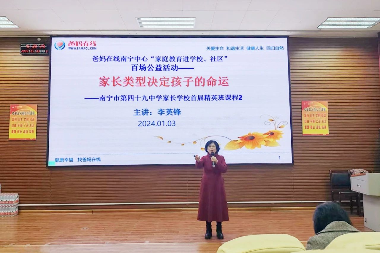 1月3日晚,一場別開生面的家庭教育公益課在南寧市第四十九中學熱烈展開。此次課程由南寧市爸媽在線中心傾情呈現,中心主任韋紅梅老師親自率隊,資深講師李英鋒老師擔綱主講,為現場的學生家長們帶來了一場主題為“父母的類型決定孩子的命運”的精彩講座。